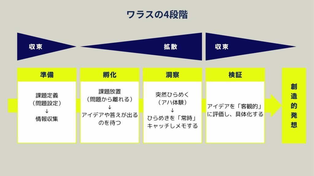 これはまさに、ワラスの4段階で説明されるプロセスそのものです。このモデルは、人間の無意識(潜在意識)の働きを含めた自然な思考の流れを捉えています。
